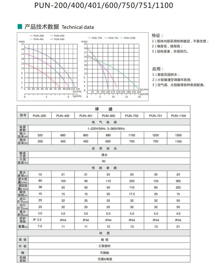 特征:1)泵体内部采用特殊镀层,不易生锈;2)噪音低,扬程高;3)结构紧凑,外观轻巧。
